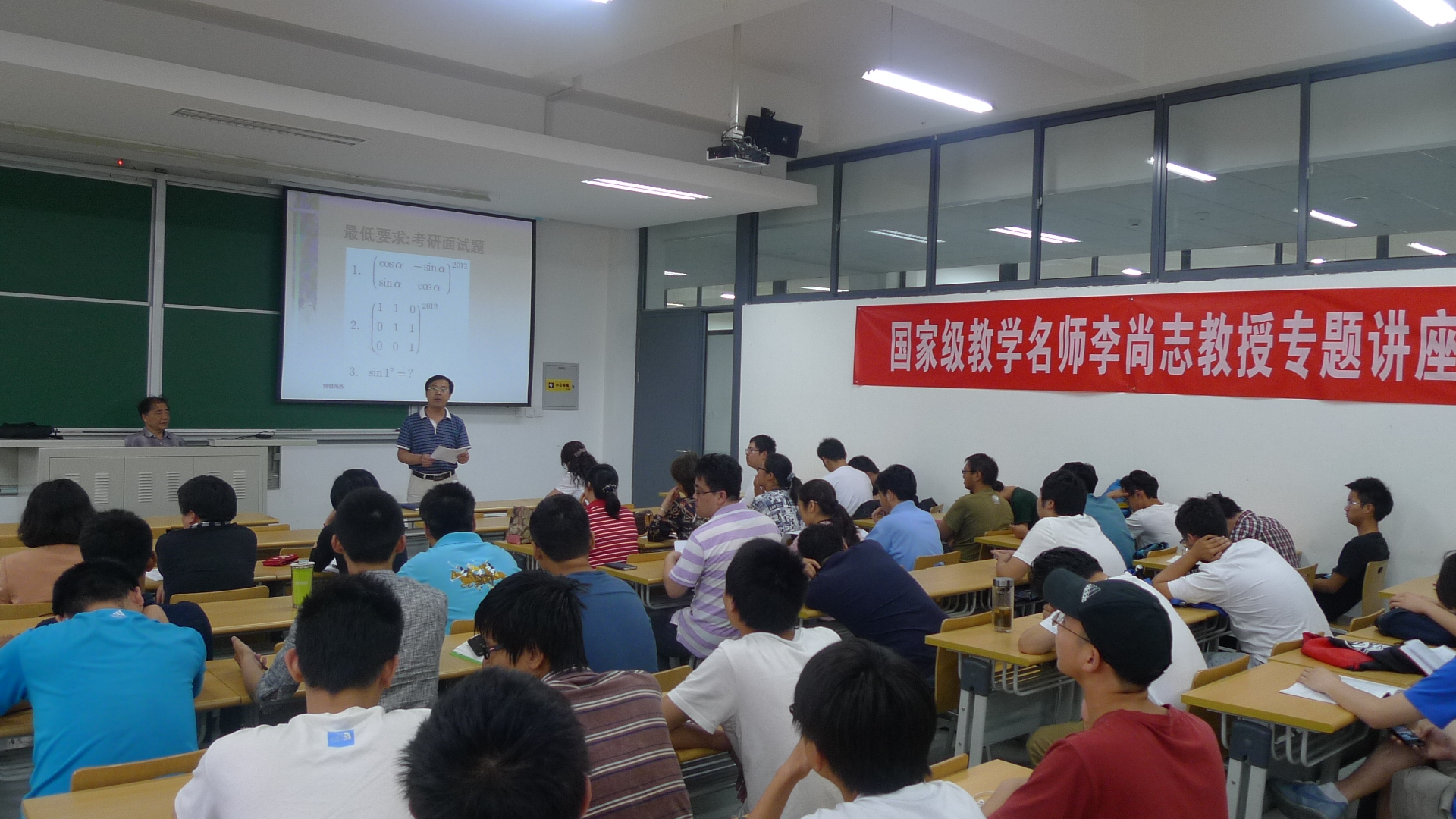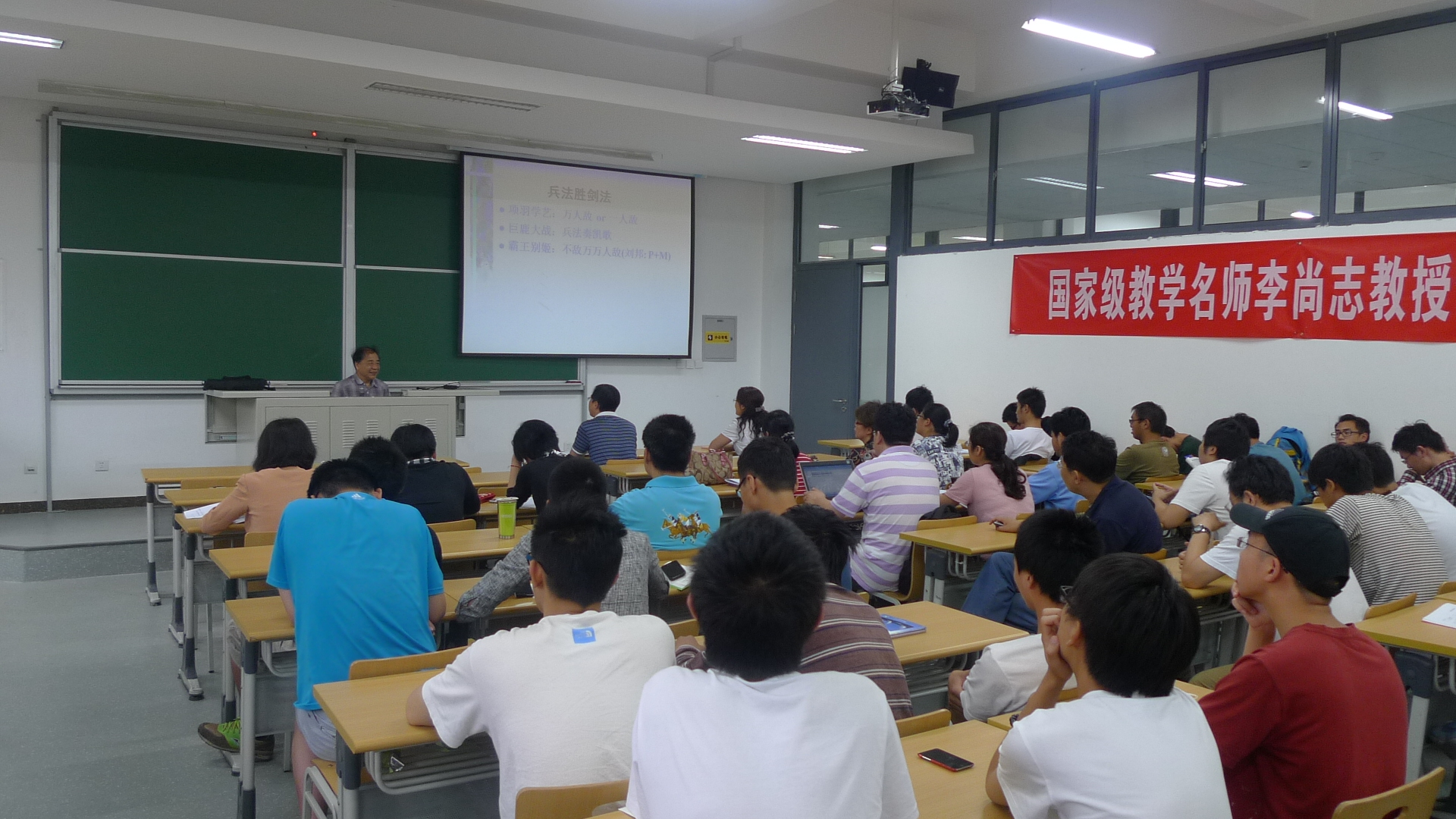 李尚志教授认为生活中的每一个角落都有数学,并列举项羽学艺、巨鹿大战、霸王别姬、九阴真经等故事去阐述数学原理,他说金庸武侠小说中的九阴真经分成上下两篇,上篇讲的是想法(idea),下篇讲的是具体招数(technique),虽然打架靠Technique,但是在idea指挥下才能对Technique应用自如,应付战场上的千变万化,没有idea的指挥,梅超风练出的Technique就只是歪门邪道。通过他幽默风趣的语言,通俗易懂地解释了大学数学的兵法与剑法之间的关系,令人兴趣盎然。随后又列举典型案例,以他独特高效的方法对难题进行了分析解答,最后他以微积分诗四首结束讲座,他形容定积分“一帆难遇风顺,一路高低不平,平平淡淡分秒,编织百味人生”,细细品味定积分就如同我们的人生。