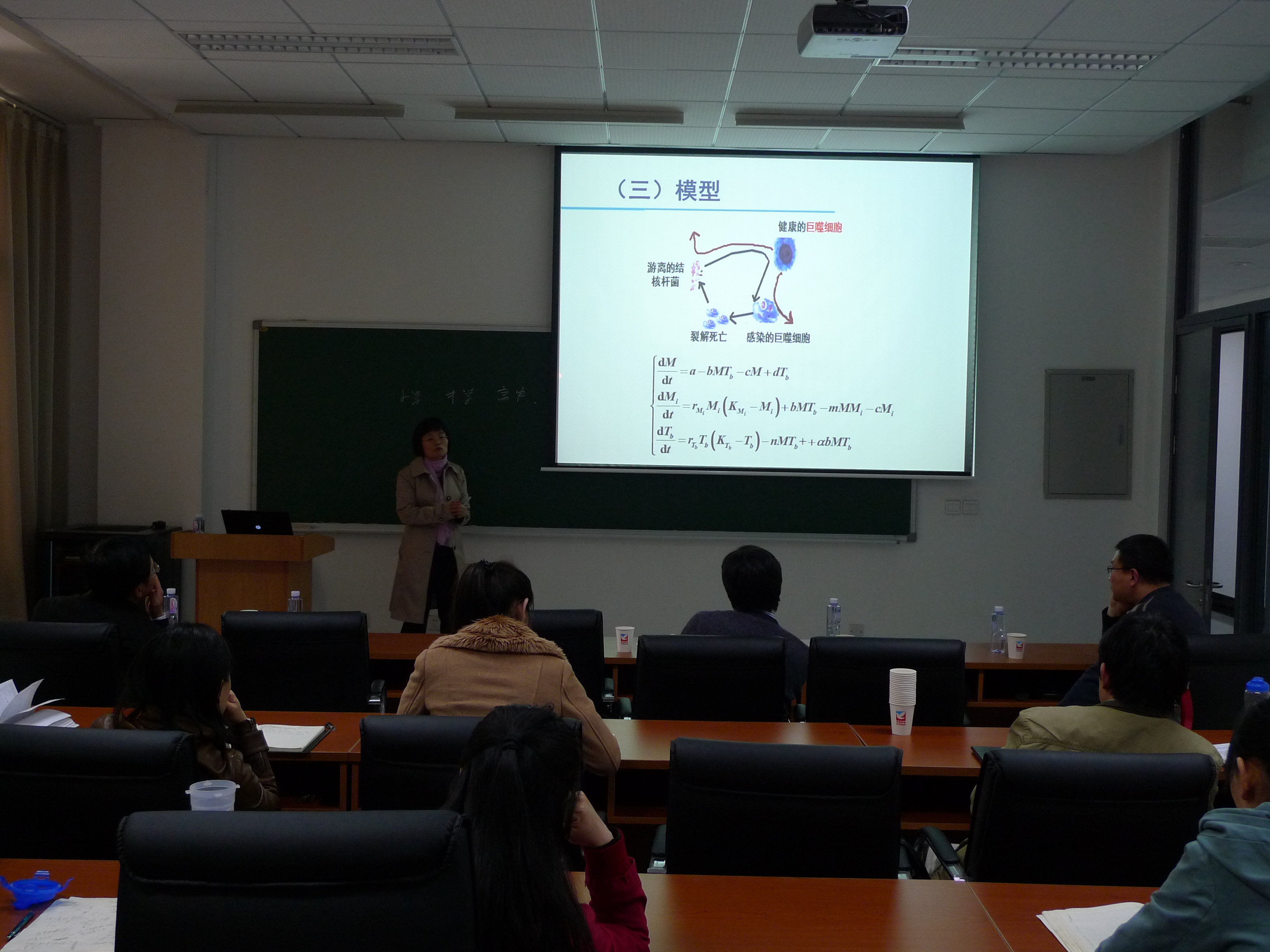 本次讲座中,三位教授展示了自己最近的研究成果,分别作了题为“小球藻的异养培养相关问题动力学建模及理论与数值分析问题”、“HIV感染人群耐药水平的测定”和“HIV与TB共感染动力学模型研究”的报告。报告中,三位教授分别介绍了小球藻异养培养过程中营养物质比例的确定及其对产量及蛋白质含量的影响、HIV感染者中治疗人群和未治疗人群耐药水平测定方法及其准确程度、HIV病毒和TB细菌在人体内的相互作用机理及其相互影响等问题。