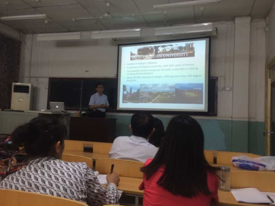 首先董建军做了题为“First-principles Theory Based Model of Thermal Conductivity of Earth’s Lower Mantle”的报告,董老师介绍了课题组在固体材料热输运方面的研究工作和最近的研究成果。随后,董建军教授介绍了Auburn University地理、人文、专业设置、248cc永利集团 (College of Mathematics and Sciences-COSAM)及物理系的科研、教学近况和未来发展计划。最后双方结合科研、教学领域的合作进行了探讨。