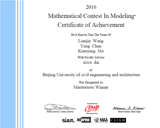 Meritorious Winner获奖证书(员工:马崑翔、陈洋、王连杰,指导老师:代西武)