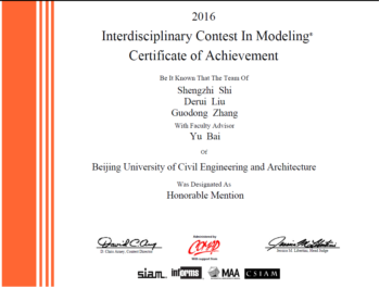 Honorable Mention获奖证书(员工:刘德睿、张国栋、石圣之,指导老师:白羽)