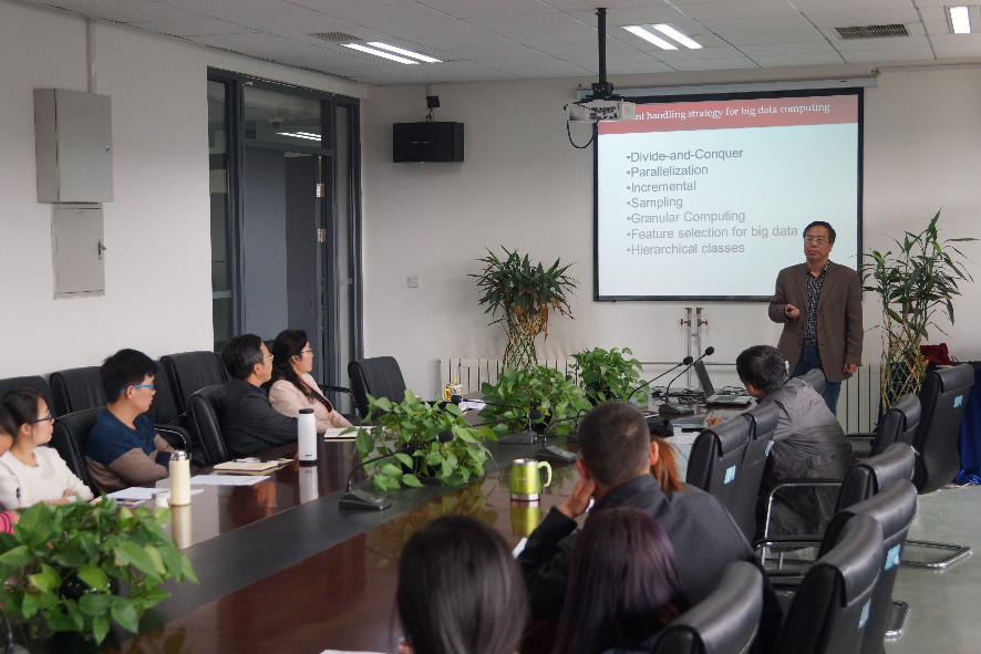 王熙照教授从“大数据的简单介绍”说起,结合他目前所做的课题,分别介绍了大数据分析面临的挑战、现阶段大数据分析的技术等方面的内容,其后重点阐述了大数据中不确定性学习中不确定性的处理对模型简化的影响,让大家对大数据中不确定性学习有了直观的认识,阐明了不确定性的表达、度量和处理对大数据学习效果有重要的影响。接着,王教授还介绍了深圳大学大数据研究所在大数据分析以及在不同领域应用方面取得的最新进展。作为大数据处理领域的专家,王教授反复强调了国际化的学术视野、先进的技术设备支持和缜密细致的实验在其研究中的重要性。最后,参会师生就目前的研究热点提出了许多问题,王教授一一详细解答,双方进行了热烈的讨论。