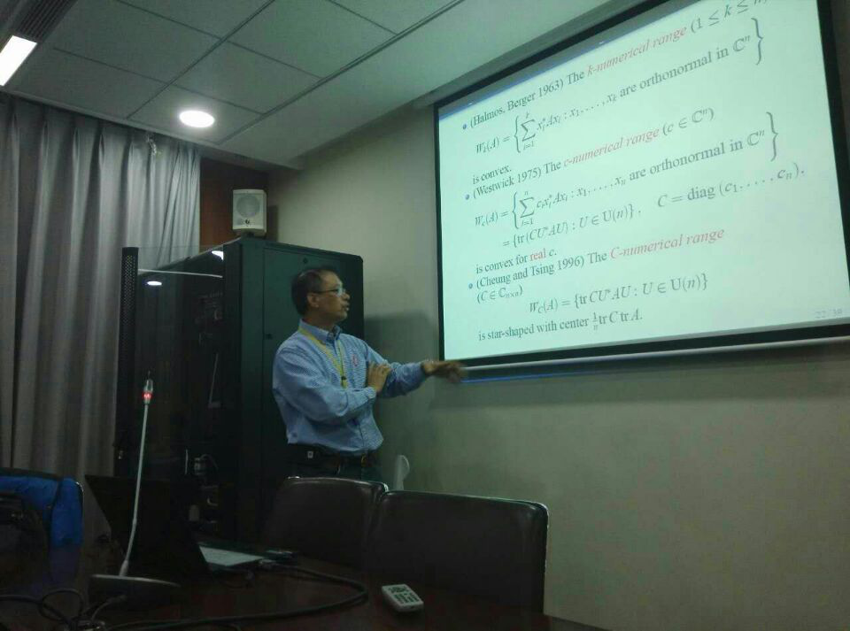 2015年12月23日下午,美国奥本大学数学与统计系系主任谭天祐教授应邀来248cc永利集团作了题为“Low and High Roads in Matrix Theory”的学术报告,近20位248cc永利集团教师及研究生参加了报告会,会议由248cc永利集团副经理白羽主持。