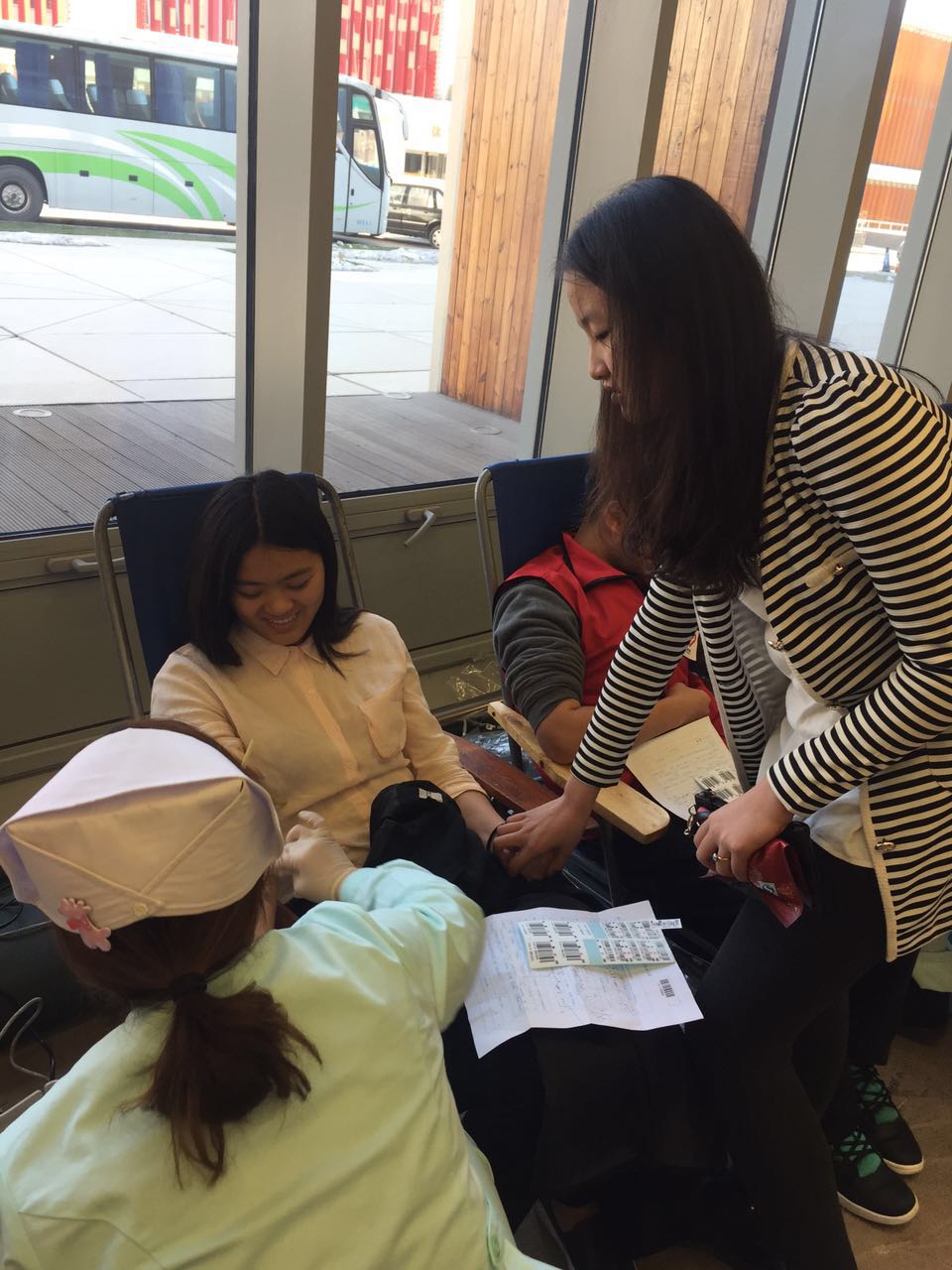 早上不到八点就陆陆续续的有同学在老员工活动中心排起了长队,献血的同学登记录入,测血压,化验,抽血......,248cc永利集团志愿者为献血者准备早餐、红糖水,也在旁边协助献血者填表,体检,贴止血贴,发献血证等,并耐心地给他们讲解献血的流程和注意事项。
