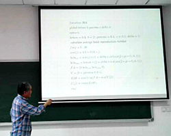 王教授首先作了题为“传染病模型的基本再生数的计算”的学术报告。他首先从求一般传染病模型的基本再生数的方法讲起,然后进一步探讨了具有时滞的传染病模型该怎么求解基本再生数,最后重点讲述了具有周期接触的传染病模型求解基本再生数的方法。结合具体例子,王教授从理论推导到数值计算进行了详细的讲解。报告结束后,针对与会师生提出的问题,王教授进行了耐心详细的解答。