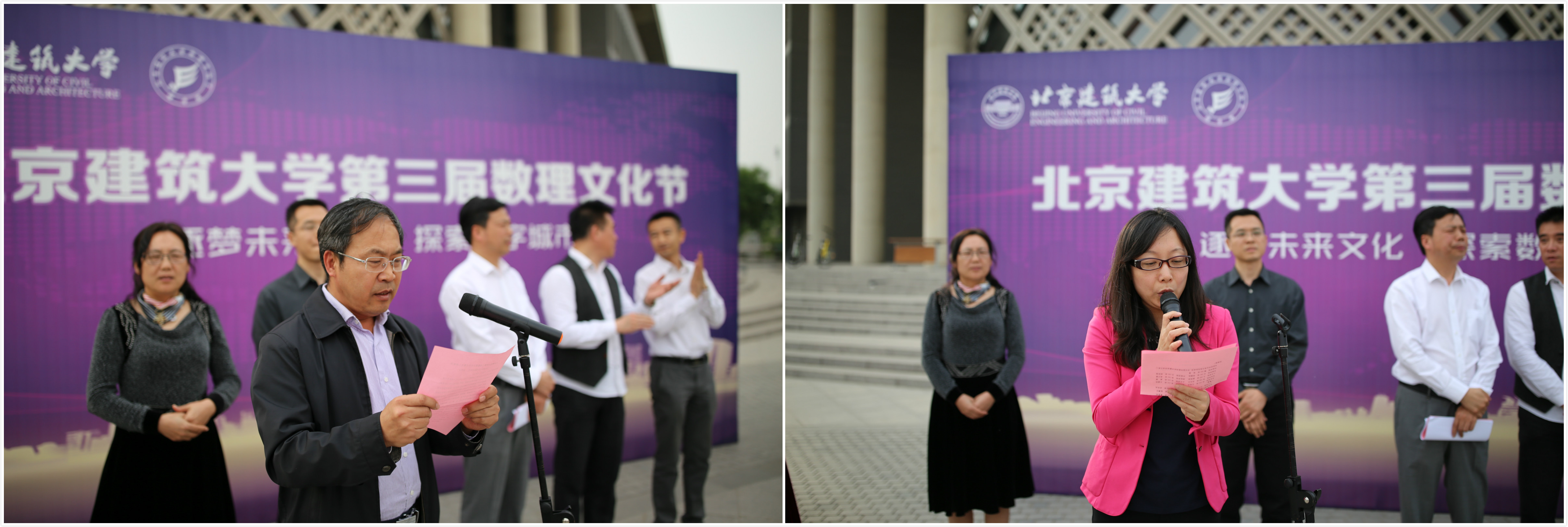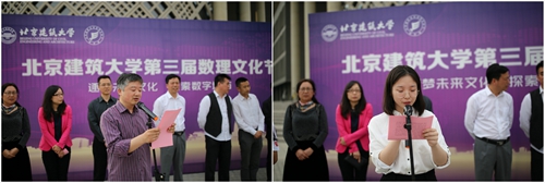 教师代表数学系何强发言,他为大家阐明了数理知识的重要性,并且解释了“数理文化节”活动的初衷,是为了把优秀的数理文化通过更新颖的形式展现给大家。之后获奖员工代表土木学院董贻晨同学发言,她感谢学校的栽培并鼓励大家好好学习数理文化知识。