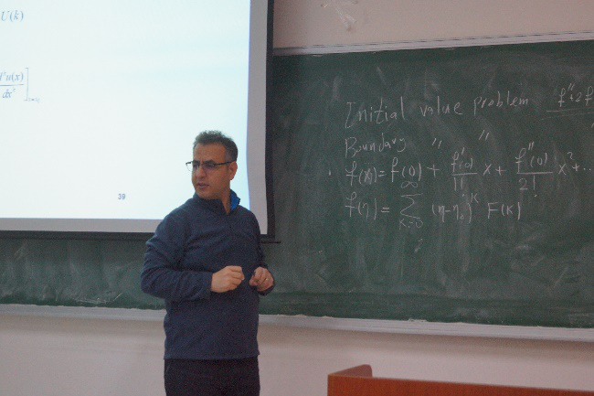Mohammad 教授首先做了题为“Advanced Analytical Methods for Solving Nonlinear Problems in Science and Engineering”的学术报告,介绍了工程领域求解非线性问题常用的高级解析方法,比如同伦分析法(HAM)、微分变换法(DTM)等等,并且通过一个非线性偏微分方程组的求解,详细阐述了DTM方法的具体步骤、优缺点等。