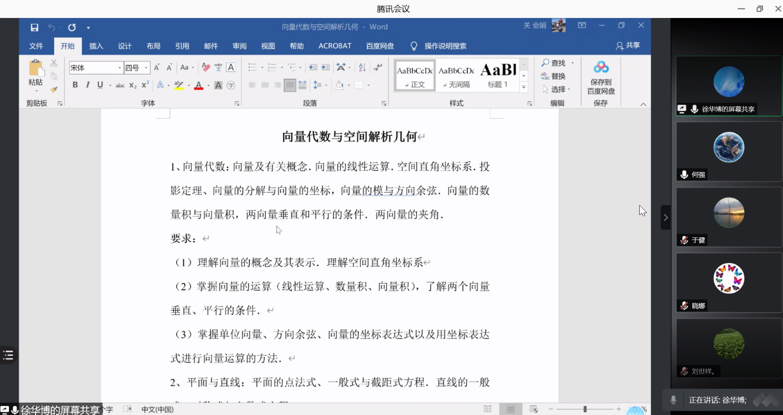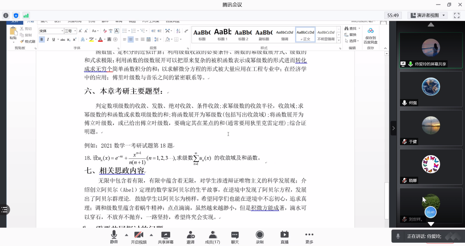 2月22日上午,高等数学教学团队以腾讯视频会议形式进行了本学期《高等数学A(2)》课程的第一次集体备课,系主任王利萍老师与全体任课老师参加了备课,会议由课程负责人何强老师主持。何老师首先介绍了本学期课程教学的整体安排,并对线上教学实施、重修生管理、助教管理等问题进行了重点说明,逐一详细地解答了老师们的问题。接下来,任课教师徐华博分析了第八章的教学要求、教学大纲、教学难点等;任课教师侍爱玲梳理了第十二章的教学要求,总结了该章考研的要点、难点、易考点以及考题形式等。最后,参会老师们进行了交流和讨论。