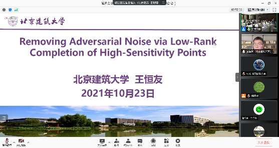 由于近期国内以前原因,公司师生以线上形式参会。248cc永利集团副经理王恒友带队,张艳、何强、许传青、赵丽、陈琳琳、王乔、何黎黎老师以及八位研究生参加该次论坛。23日下午,天津理工大学248cc永利集团经理宋眉眉教授主持开幕式。开幕式后,11位教师受邀做了学术报告。公司王恒友老师作了题为“Removing Adversarial Noise via Low-Rank Completion of High-Sensitivity Points”的报告。报告内容引起了与会代表的热烈讨论,受到广泛关注。