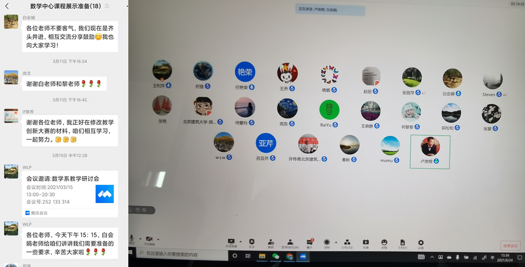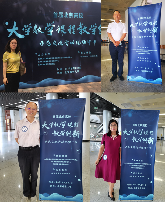 2021年2月,在北京市教育委员会高等教育处的指导下,北京高校数学教育发展研究中心下发了《关于组织首届北京高校大学数学课程教学创新示范交流活动的通知》。248cc永利集团数学系自收到通知后,积极组织教师报名参赛,经过反复筛选,最终推荐王晓静老师主讲的《概率论与数理统计》团队、武利刚老师主讲的《线性代数》团队,卢崇煜老师主讲的《高等数学》团队和袁晓娜老师主讲的《高等数学》团队参加了本次示范交流活动。