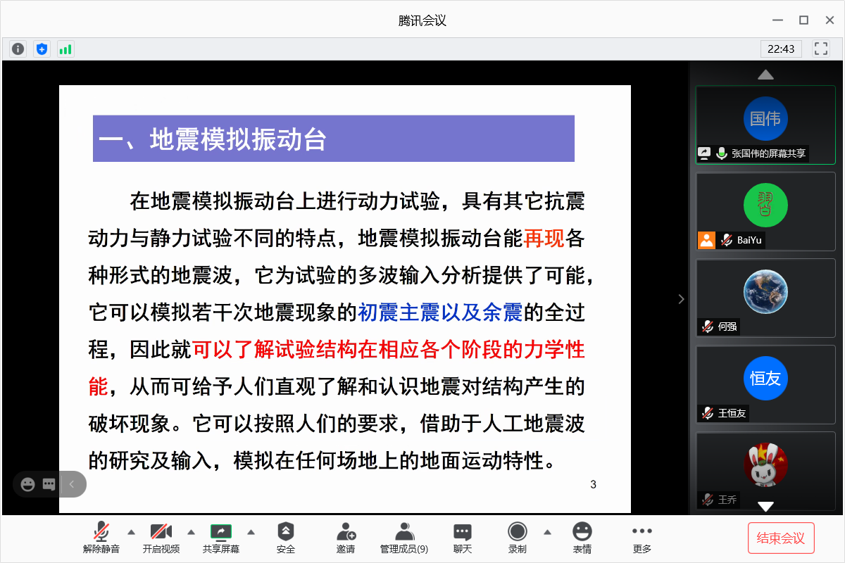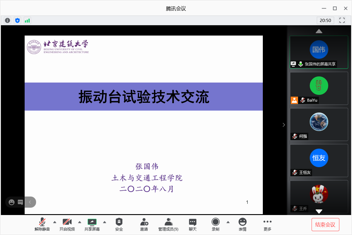 2020年8月21日上午,248cc永利集团邀请土木学院大型多功能振动台阵实验室的张国伟教授和数学系、力学系和物理系的相关老师进行了“振动台试验技术交流”,十余位老师参与了线上交流活动,活动由248cc永利集团副经理白羽主持。