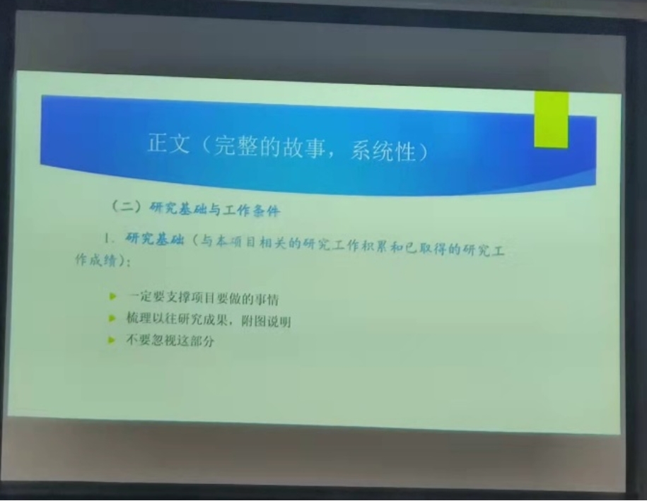 崔老师主要从基金评审的角度进行了介绍了如何撰写申请书。他强调,评审时不太看重工作积累,更看重发展潜力,而且一定要重视创新点,要写出自己的亮点。
