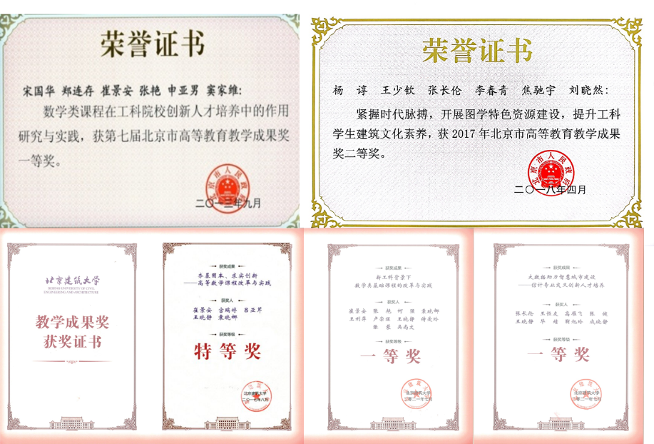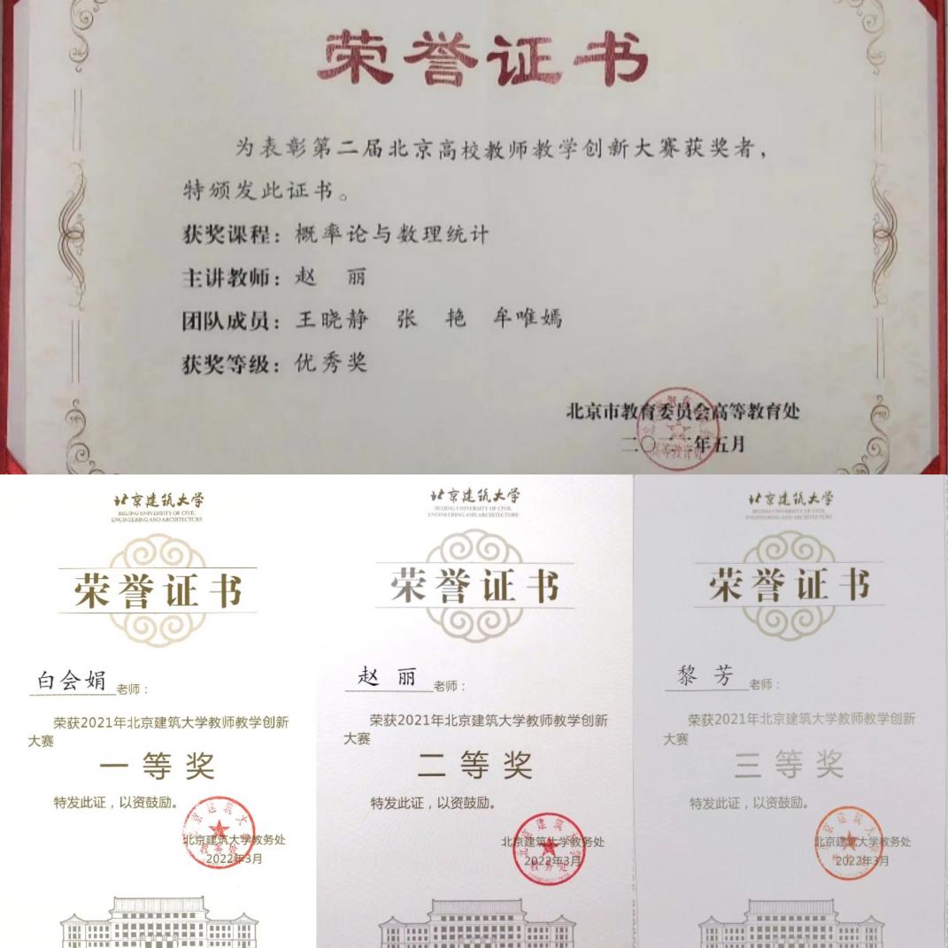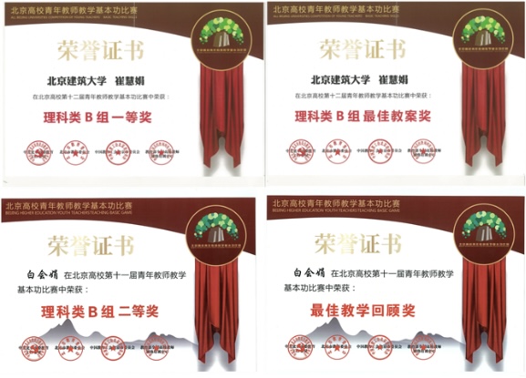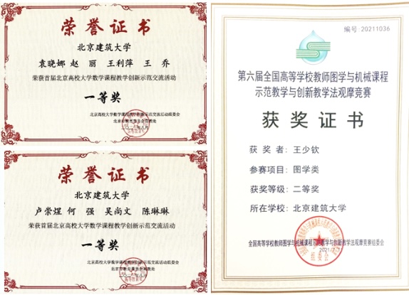 教师教学能力大幅提升。先后荣获北京高校青年教师教学基本功比赛一等奖1项,包揽最佳教案、最受员工欢迎、最佳教学反思、最佳现场展示和优秀指导教师等全部5项单项奖,二等奖1项和最佳教学反思奖;获全国高等学校教师图学与机械课程示范教学与创新教学法观摩竞赛图学类二等奖1项;首届北京高校大学数学课程教学创新示范交流活动中获一等奖2人,二等奖1人;第二届北京高校教师教学创新大赛获优秀奖1人;校青年教师教学基本功比赛获一等奖5人;校首届教学创新大赛获一等奖、二等奖和三等奖各1人;校首届教书育人“最美课堂”评比获一等奖、二等奖各1人;校教学优秀奖评选中获一等奖、二等奖和三等奖各2人;6位新入职教师教学能力考核合格,优秀3人。