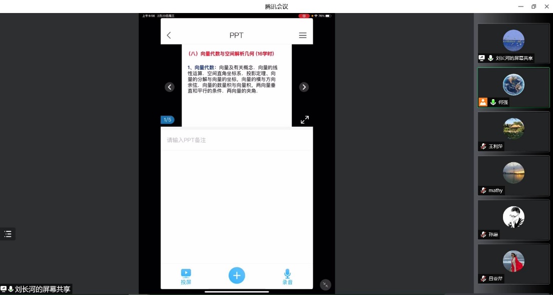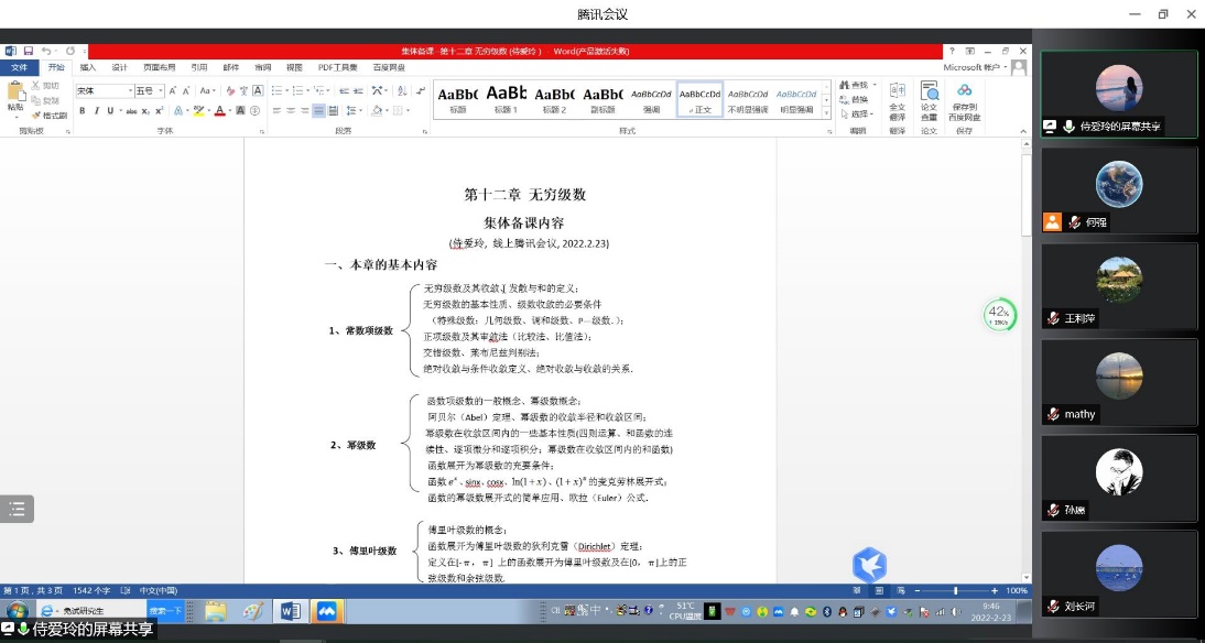 2月23日上午,高等数学教学团队在线上进行了2022年春季学期的第一次集体备课,分析了上学期《高等数学A(1)》的月考与期末成绩情况,共同研讨了《高等数学A(2)》第八章和第十二章的教学内容。全体高等数学任课教师和部分青年教师参加了会议,会议由数学与数据科学系副主任何强老师主持。