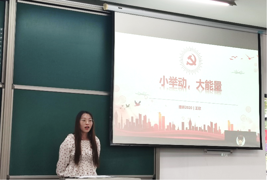 20级研究生王欣,以“小举动,大能量”为题,分享了暑假期间和弟弟共同救助溺水儿童的故事。尽管是“小举动”,但发挥了党员“大能量”,挽救了溺水儿童的生命。号召同学们在学习生活中,积极释放青年能量,充分发挥主观能动性,让青春之花在党和国家最需要的地方绽放。