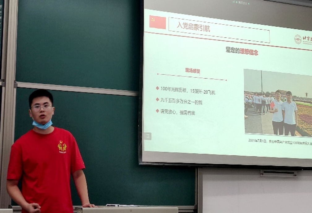 20级研究生洪久胜,作为参加中国共产党成立100周年庆祝大会现场亲历者,以“参加建党百年活动谈入党的事”为题,从入党有什么“好处”?、如何成为一名合格的员工党员?我心中的党是什么样子?三个部分进行了分享。提出一名合格的员工党员有八个方面需要努力,不仅要从组织上入党,也要从思想与行动上入党,向新生发出了“请党放心,强国有我”时代最强音的召唤!
