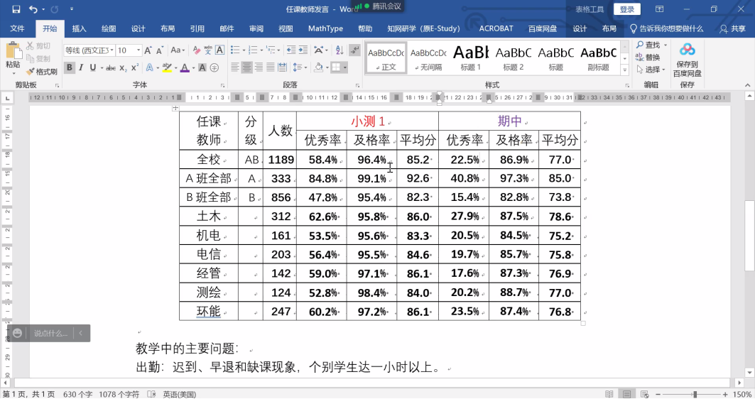 随后,何强老师对第一次随堂测验和期中考试成绩进行了分析,强调了本学期第二次随堂测验的时间和题型,并汇总了本学期线上授课中的各种问题,包括出勤、作业、答疑以及课上互动等教学管理问题,提出任课教师要结合线上教学特点,有针对性的开展教学创新,既抓住员工注意力,又保证教学效果。
