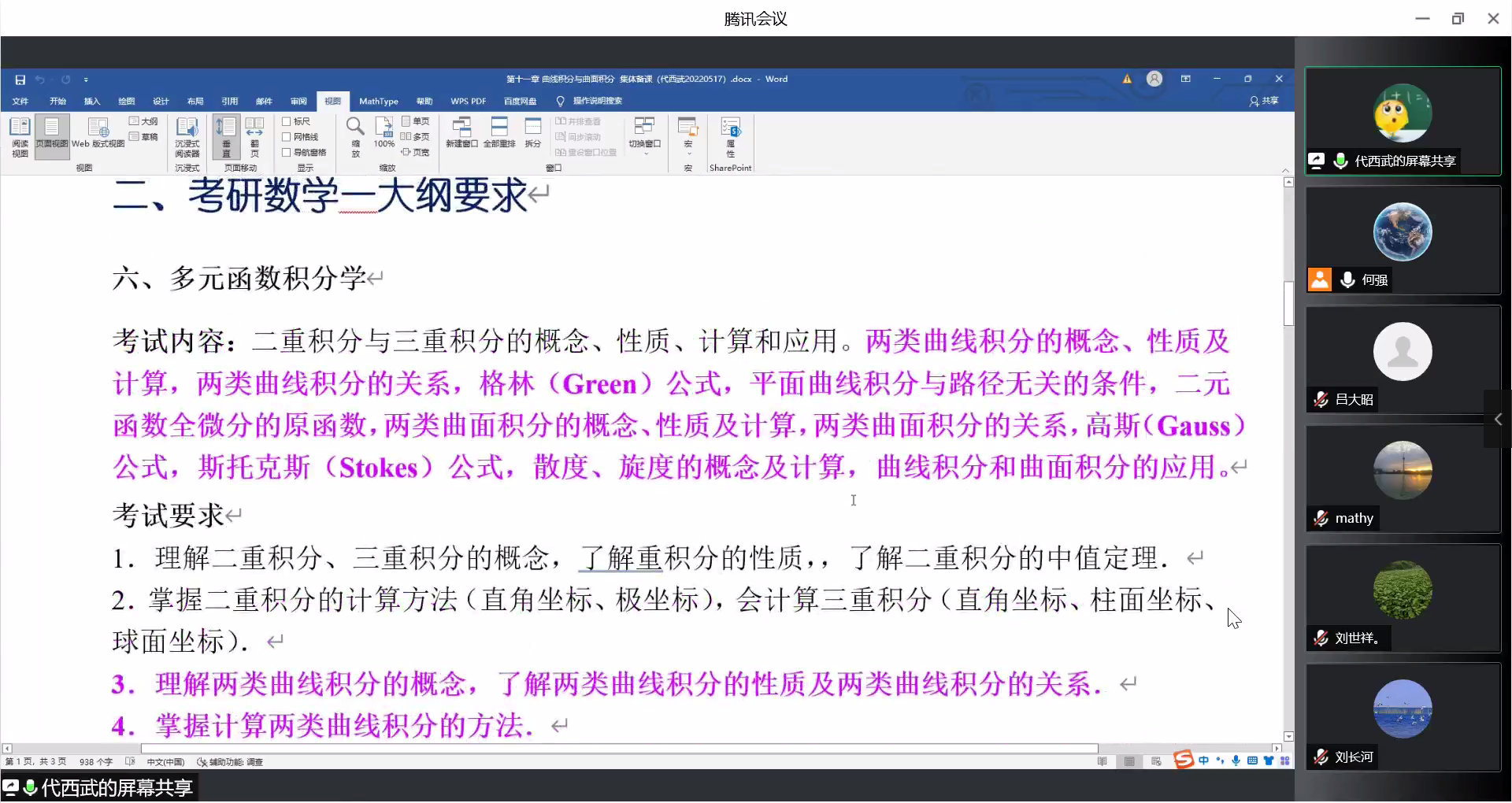 首先,任课教师代西武从两类曲线积分和两类曲面积分的角度介绍了第十一章“曲线积分和曲面积分”的主要内容,结合教学大纲分析了教学过程中重难点,指出了员工在该章节学习过程中的困难和问题,近几年期末考试时该章节内容得分率较低的主要因素是积分种类较多,员工复习不充分导致难以区分积分类型,进而无法找到对应的方法进行计算积分。代老师提醒大家要强调重难点,引导员工多看多练,下功夫准确把握各类积分。此外,他还对比了该章节的考研大纲和公司的教学大纲,指出了两者之间的异同,分析了近几年考研试卷涉及的该章内容的题目,并给出了解题思路。