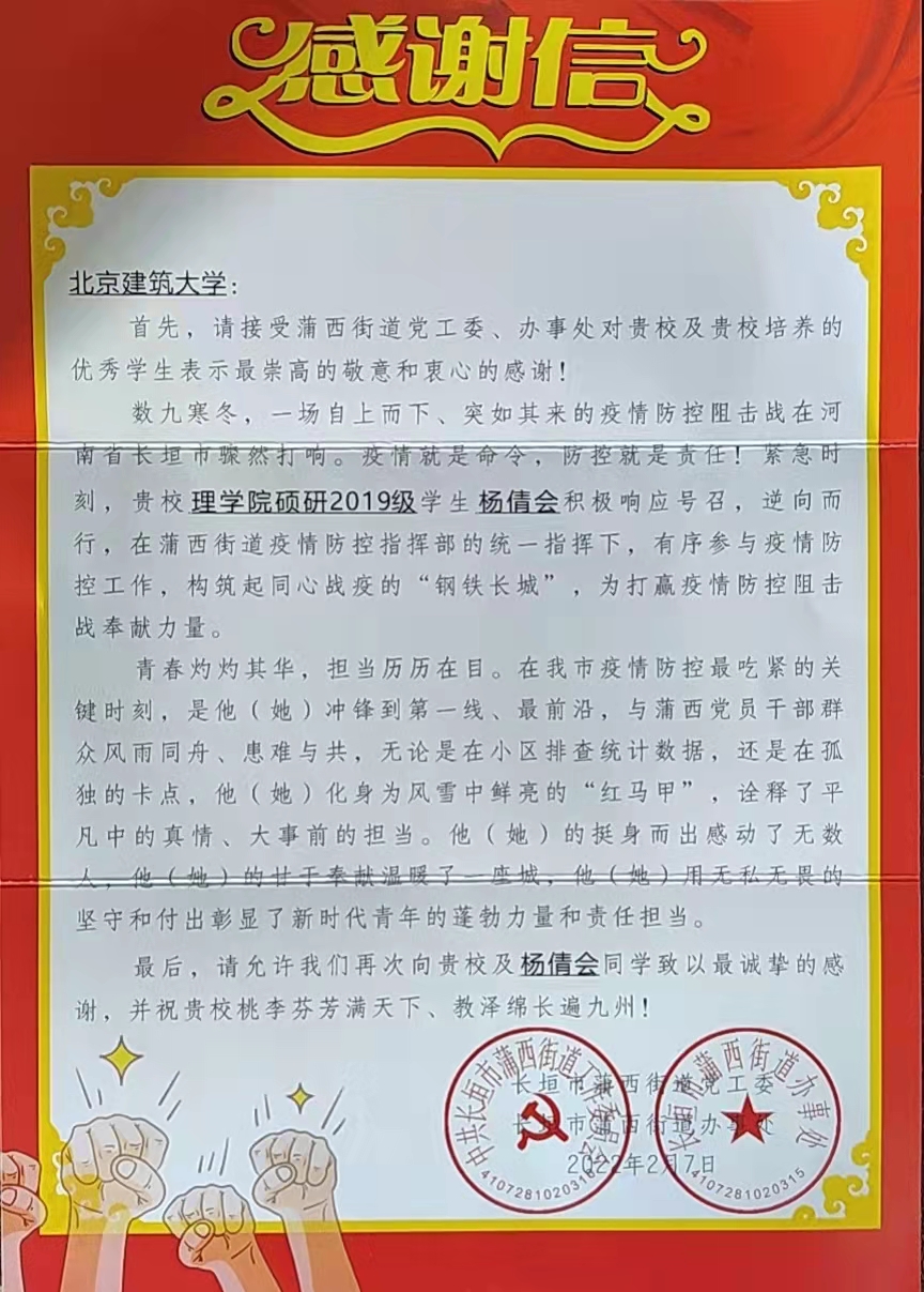当地疫情散去后,中共长垣市蒲西街道工作委员会向学校发来感谢信,感谢杨倩会积极参与疫情防控工作,构筑起同心战疫的“钢铁长城”;感谢学校培养了优秀的员工,祝学校桃李芬芳满天下,教泽绵长遍九州!