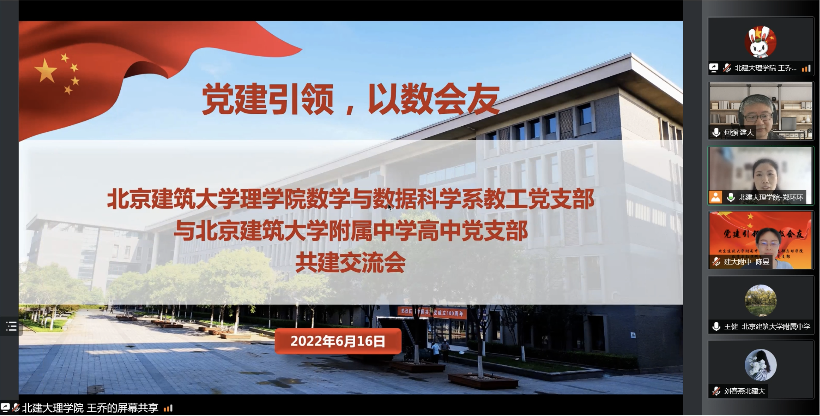 2022年6月16日下午,248cc永利集团和永利官网附属中学以“党建引领,以数会友”为主题开展党支部共建活动,建大附中高中党支部书记王健、高中部数学教研组长陈昱和高中部数学教师代表,248cc永利集团数学与数据科学系教工党支部书记王乔、系副主任何强和教师代表共计15人参加了交流活动。活动由248cc永利集团专职组织员郑环环主持。