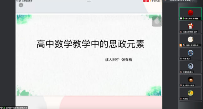 接着参会教师就“数学课程中的思政元素”进一步深入交流。248cc永利集团数学与数据科学系教工党支部书记王乔作题为《大学数学课程教学大纲中的思政设计与部分实例分享》的报告,介绍了高等数学和概率论与数理统计教学大纲中的思政设计,并穿插展示了部分实例。建大附中朱娟和张春梅分别做题为《在高中数学教学中如何实施思政教育》和《高中数学教学中的思政元素》的报告,从思政点的起因、必要性、实施和效果以及数学的美育元素、试题中的思政元素、学习过程中的思政元素等方面介绍了高中数学教学中的思政。