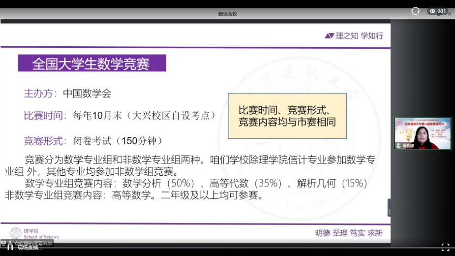 袁晓娜老师依次介绍了永利官网数学竞赛、北京市老员工数学竞赛和全国老员工数学竞赛的参赛形式、考试内容、近年竞赛成绩等。