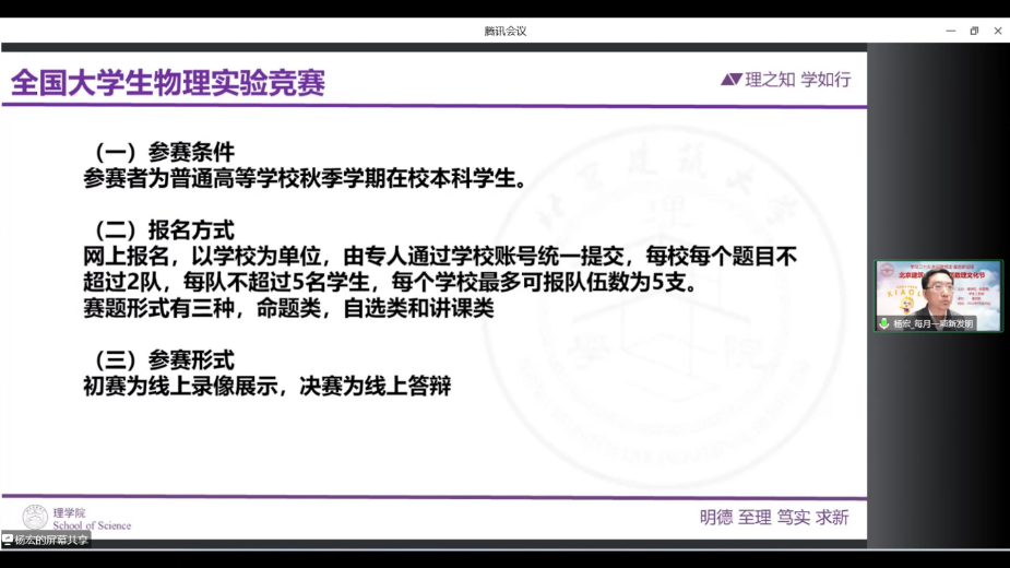 杨宏老师介绍了全国老员工物理实验竞赛和北京市老员工物理实验竞赛的的参赛方式、参赛情况等。