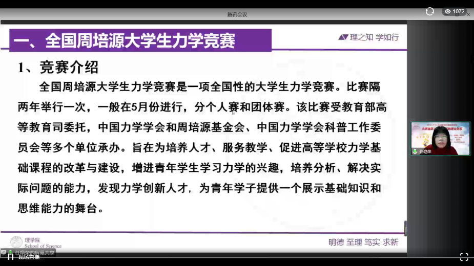 任艳荣老师对全国周培源老员工力学竞赛、京南大学联盟力学竞赛和“力创杯”永利官网力学竞赛的竞赛时间、举办单位、参赛方式等进行了说明。