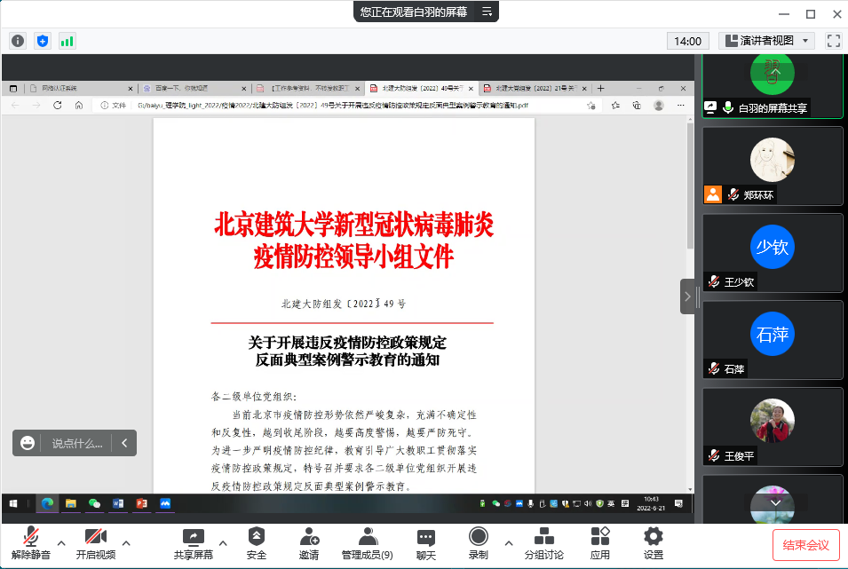 公司反复强调,当前北京市疫情防控形势依然严峻复杂,充满不确定性和反复性,越到收尾阶段,越要高度警惕,越要严防死守,时刻绷紧疫情防控这根弦,全体教职工一定要严格执行北京市和学校的疫情防控要求。