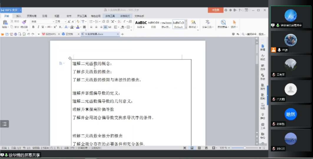 首先,徐华博老师介绍了第九章“多元函数微分法及其应用”的内容,梳理了本章六小节中需了解并掌握的知识点,并给出相应的知识脉络,使得本章知识结构一目了然;同时指出章节内容的重点和难点,例如多元复合函数求导的链式法则、空间曲线的切线和法平面、空间曲面的切平面和法线、条件极值等。